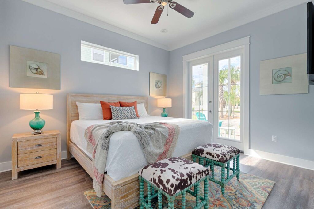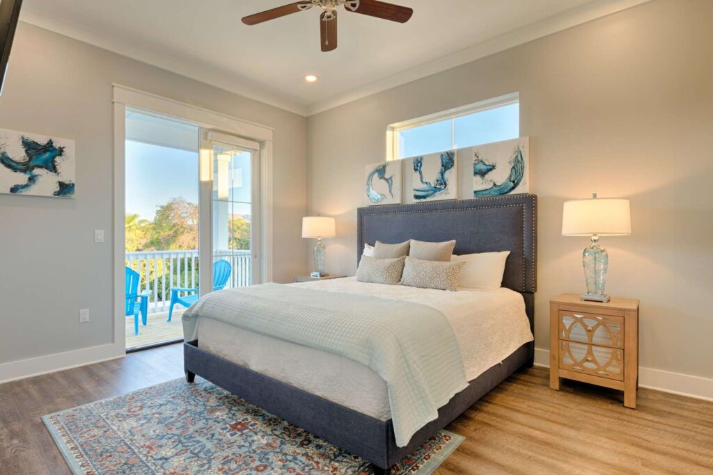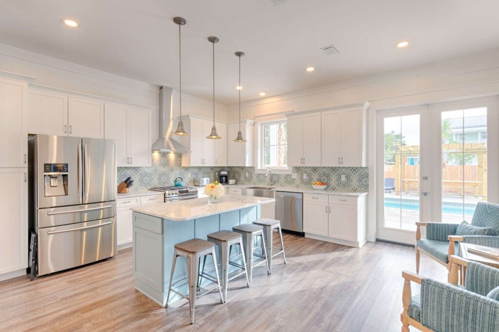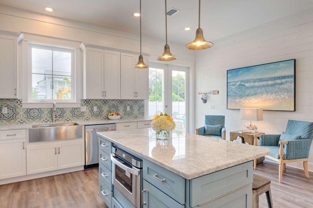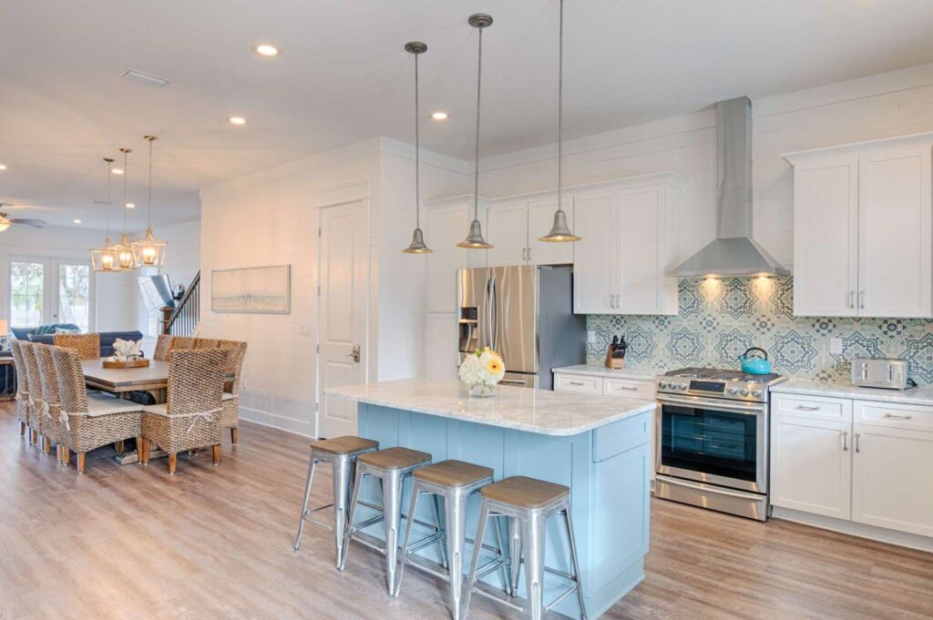 The kitchen and bathrooms are appointed with marble and granite counters coupled with breathtaking hand painted imported Italian tiles, but the perks don’t end there! A standalone industrial ice machine assures 40lbs of ice per day for our guests, a gas range for cooking a feast and when you’re ready to wind down you can relax in luxury on our European pillow-top mattresses. From smart TV’s in every room, high speed internet and Wi-Fi, to the simple things like ship-lap interiors and warm colors that bring your mind to ease Aqua Viva is truly a one-of-a-kind home that blends modern luxury with timeless design.
