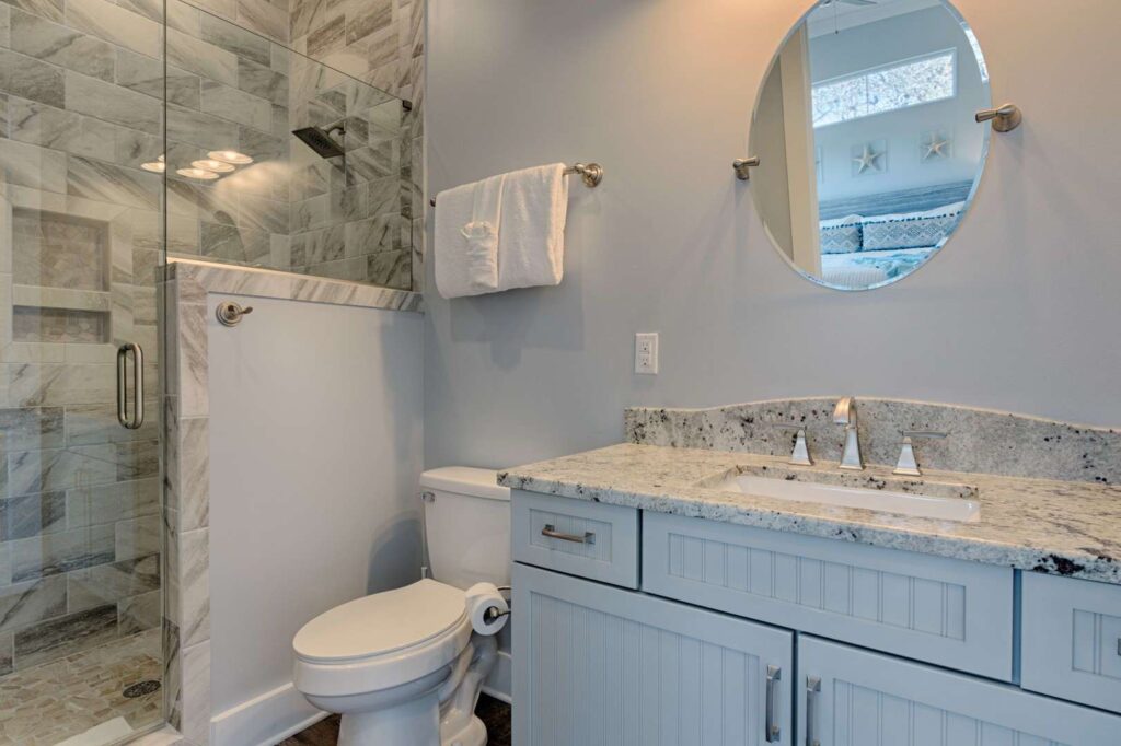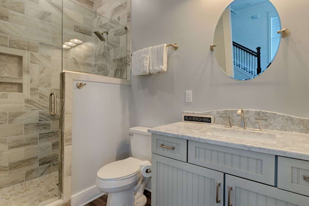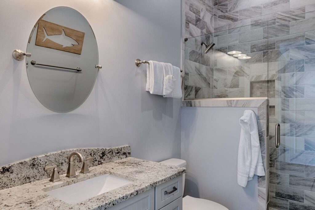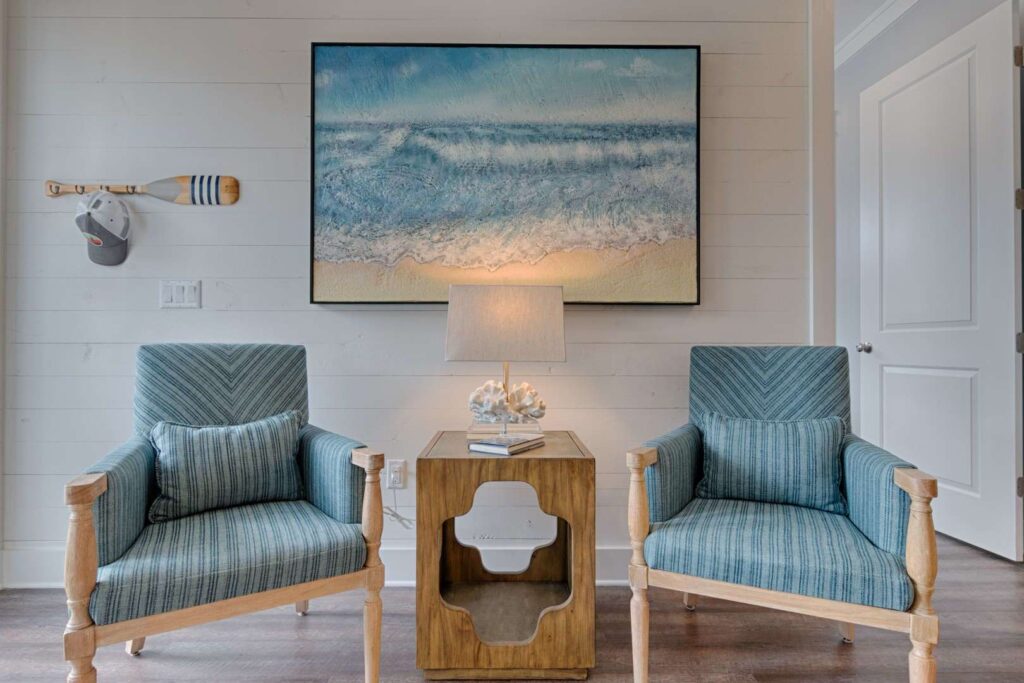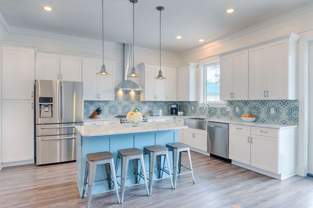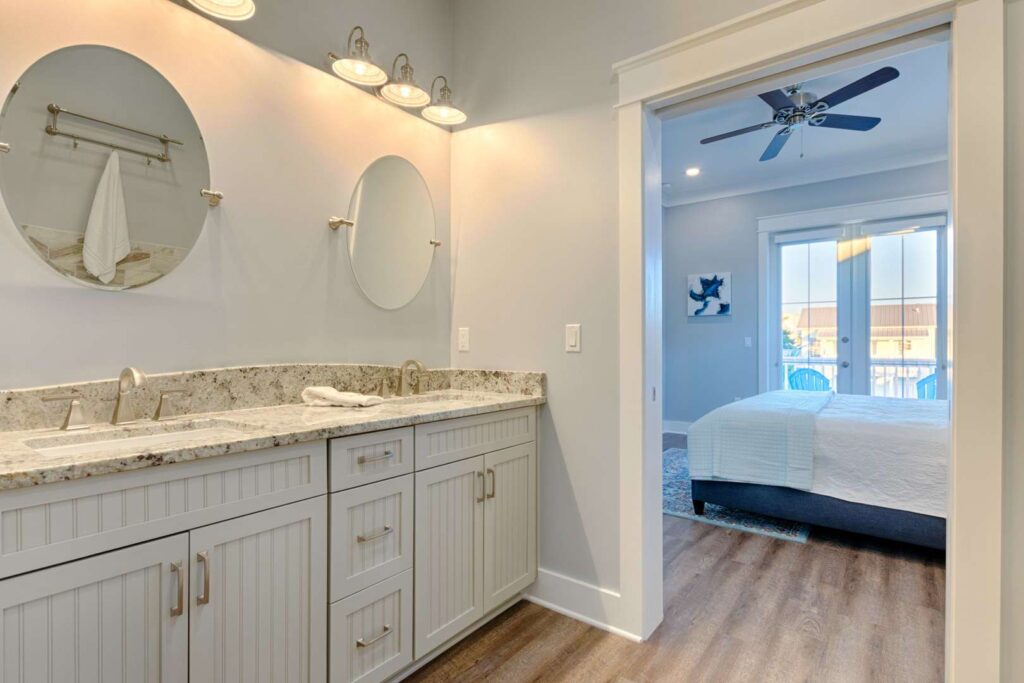 The kitchen and bathrooms are appointed with marble and granite counters coupled with breathtaking hand painted imported Italian tiles, but the perks don’t end there! A standalone industrial ice machine assures 40lbs of ice per day for our guests, a gas range for cooking a feast and when you’re ready to wind down you can relax in luxury on our European pillow-top mattresses. From smart TV’s in every room, high speed internet and Wi-Fi, to the simple things like ship-lap interiors and warm colors that bring your mind to ease Aqua Viva is truly a one-of-a-kind home that blends modern luxury with timeless design.