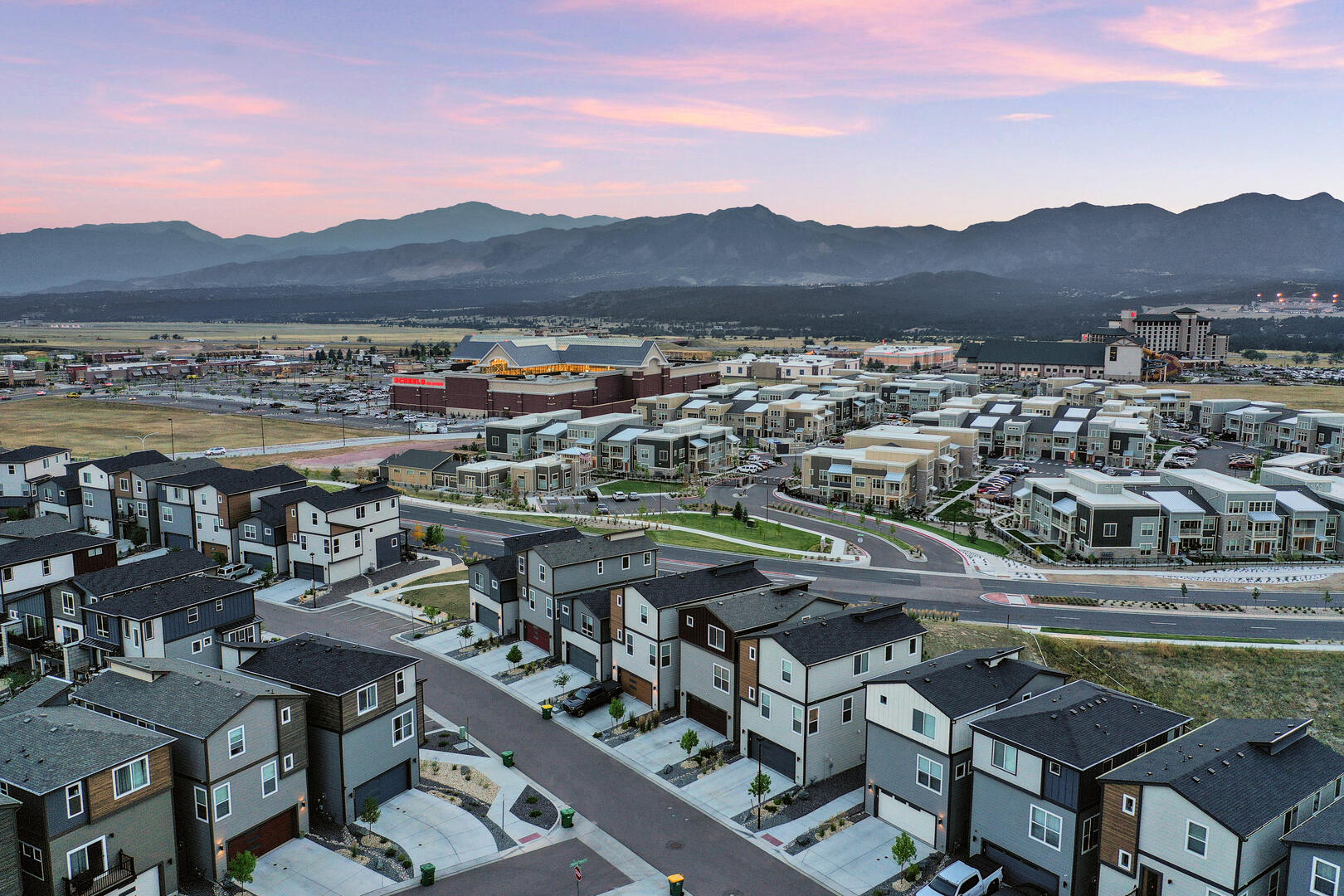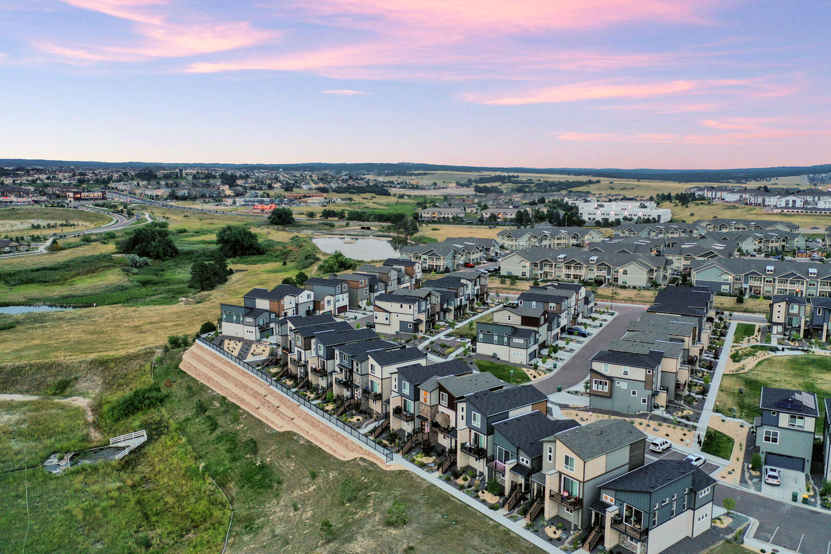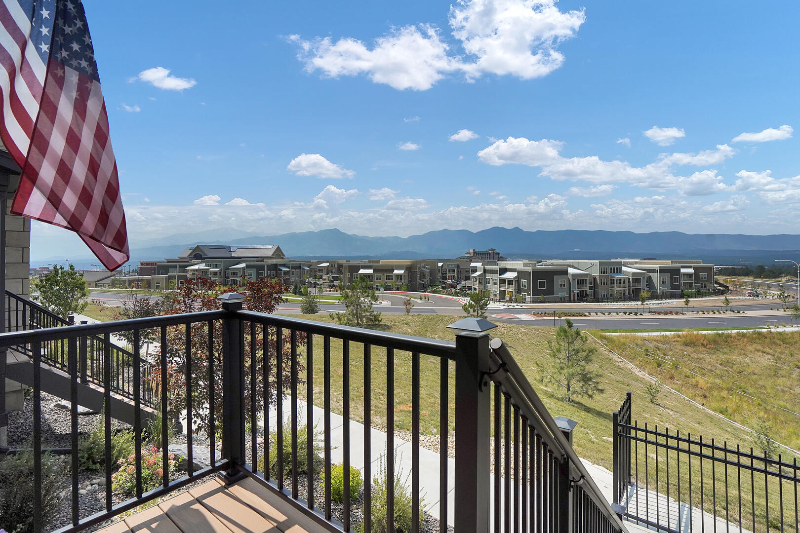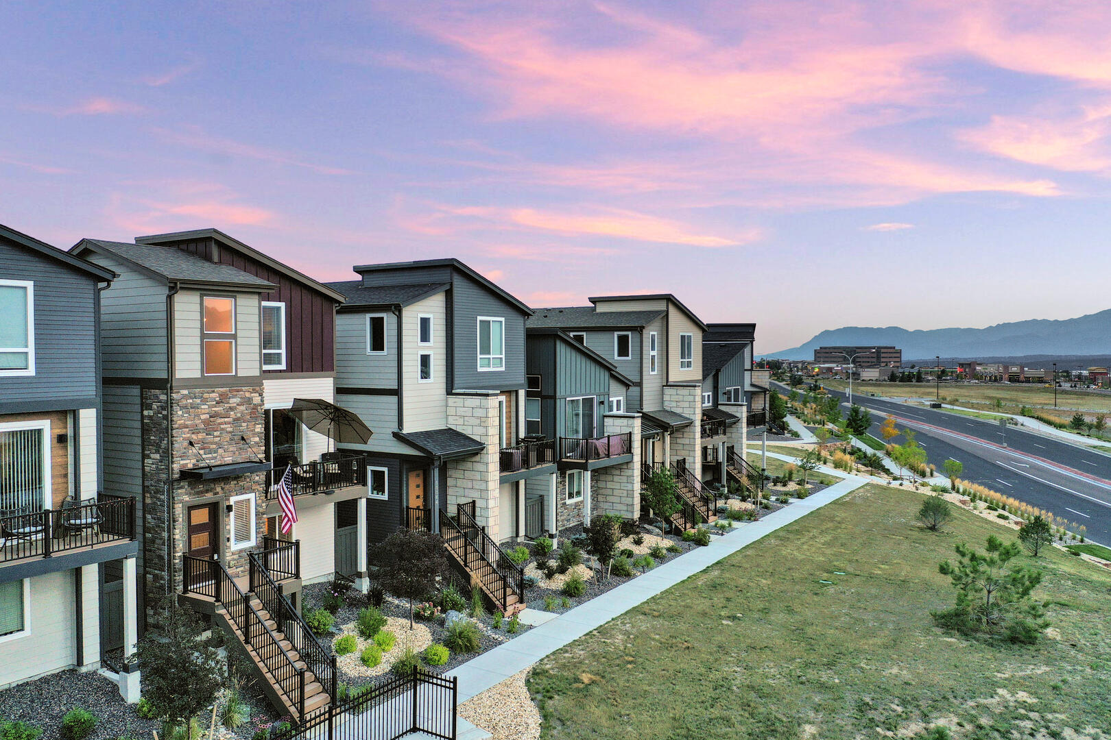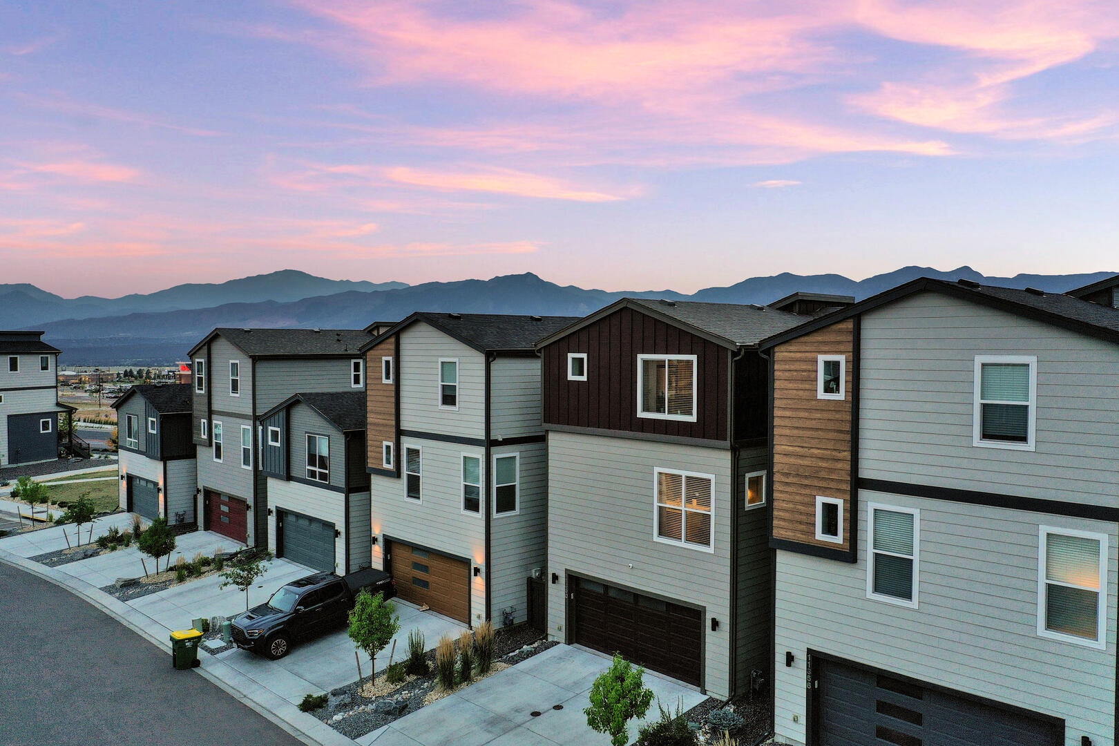 Inside: The fun factor begins with the modern, open design. The 3-Level home has luxurious LVP flooring, upgraded bathrooms, quartz countertops, a gourmet kitchen w/ island, custom light fixtures, plus an Alexa smart home system that controls the radio, lights, and garage door - all activated by your phone, plus there is an Echo system for the upstairs area. The base level of the home features a 2-car garage and a bedroom that doubles as a highly functional office w/ views. The next level of the home features an open great room design w/ the upgraded LVP flooring and a walkout to the private composite deck that showcases those breathtaking views. Back inside. the kitchen has upgraded cabinets, a separate island, a gas range, and a large eat-in dining space. The upper level of the home has two bedrooms. The Owner's Suite is complete with an electric fireplace and a private bathroom & THOSE VIEWS are out of the Owner's bedroom window. The secondary bedroom has access to a separate full bathroom. If you are looking for a home with just the right amount of useful square footage with a modern design that will ignite your senses, you have found it here! You will love the access to the green space and picnic area across the street from the property. This is an amazing new way to live in Colorado Springs! You don't have to maintain a yard. Close access to 1-25 and commutable to both Colorado Springs and Denver.