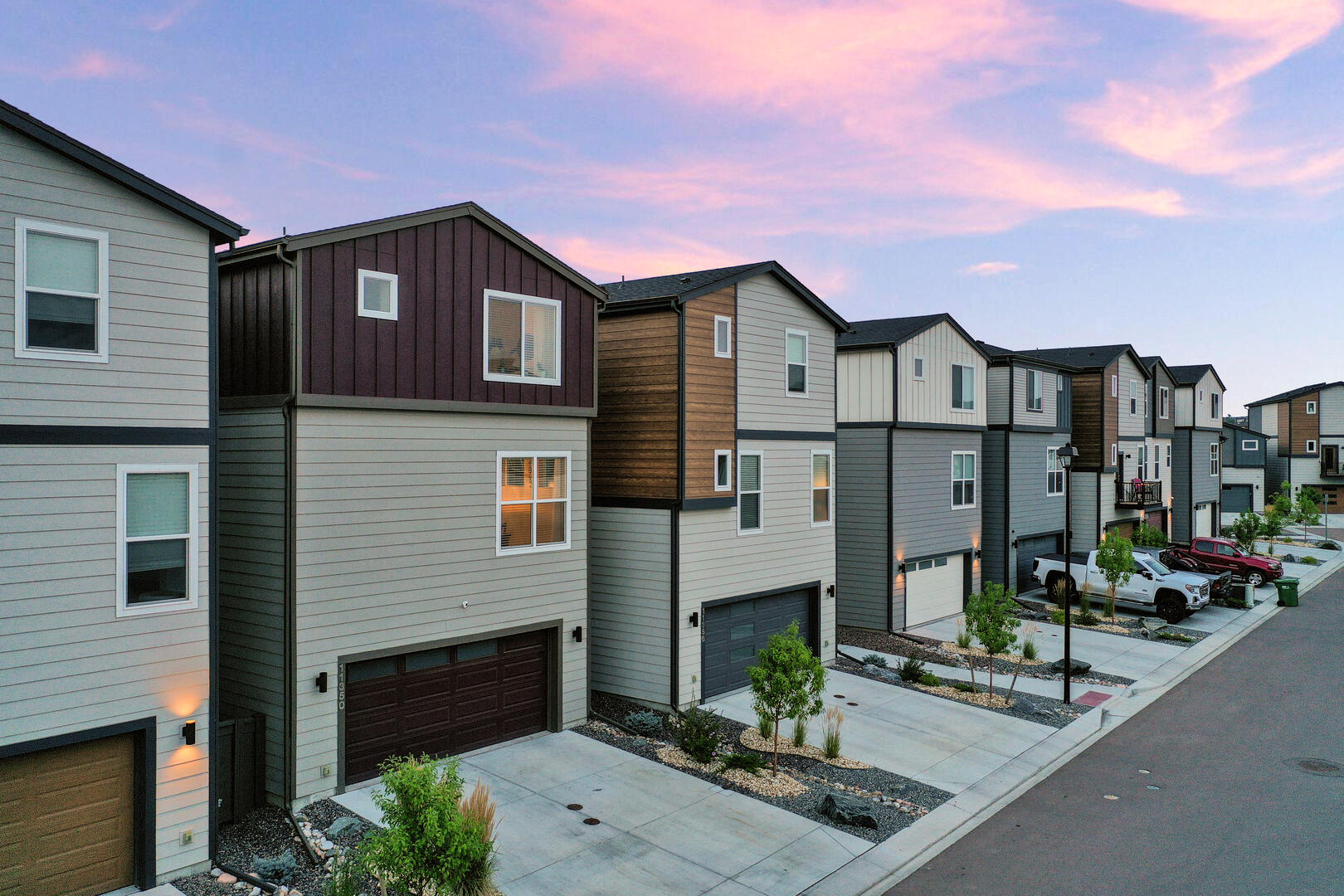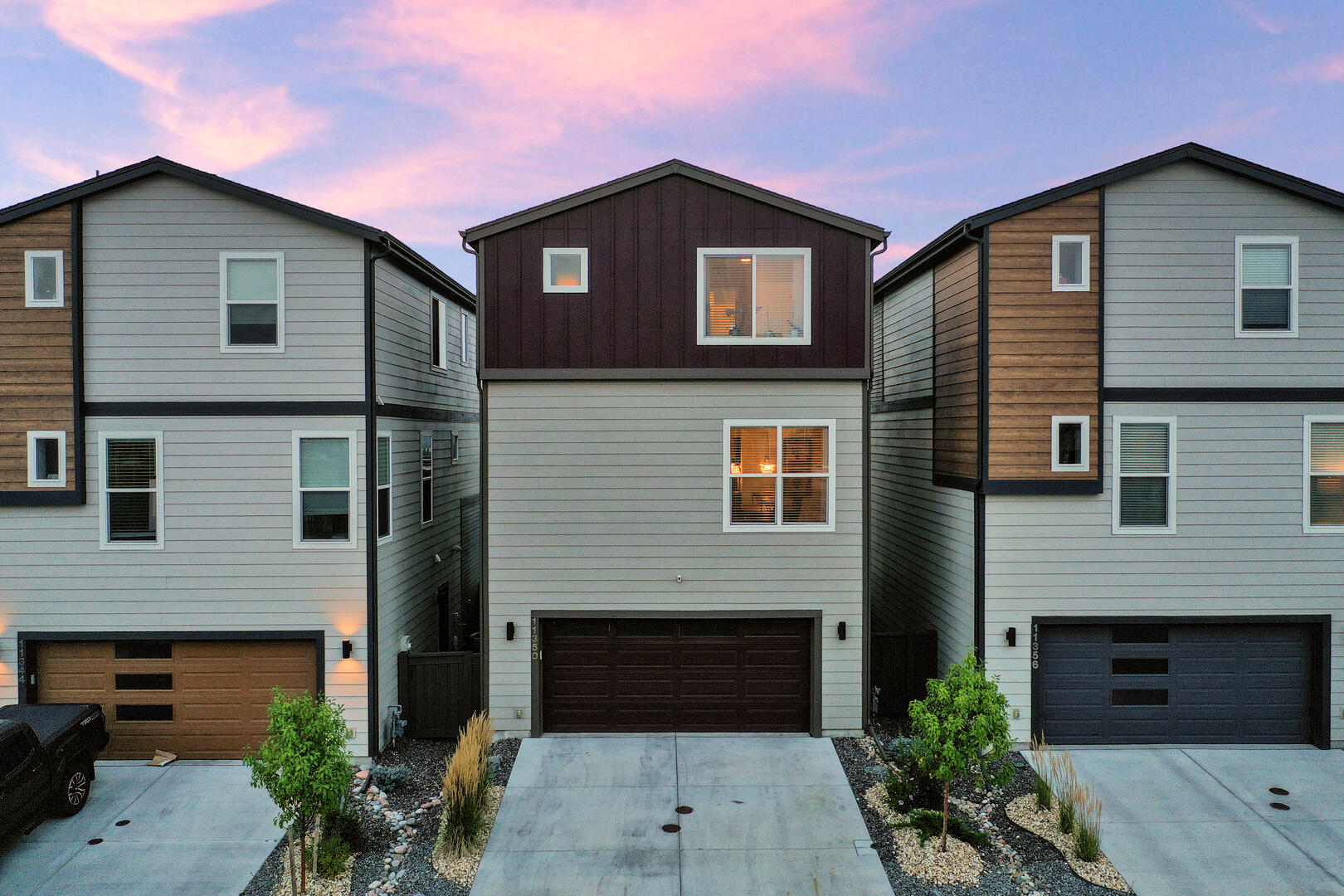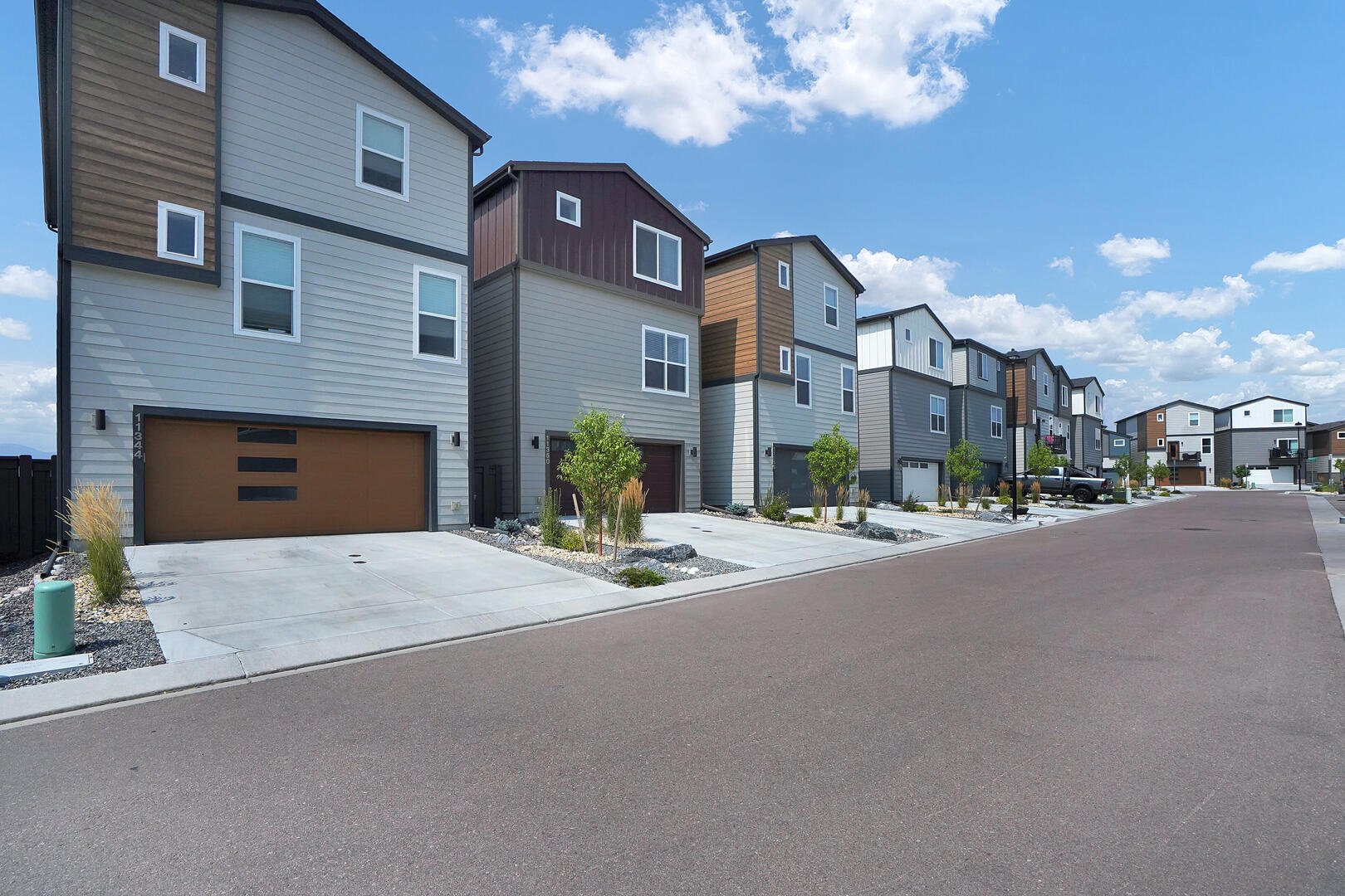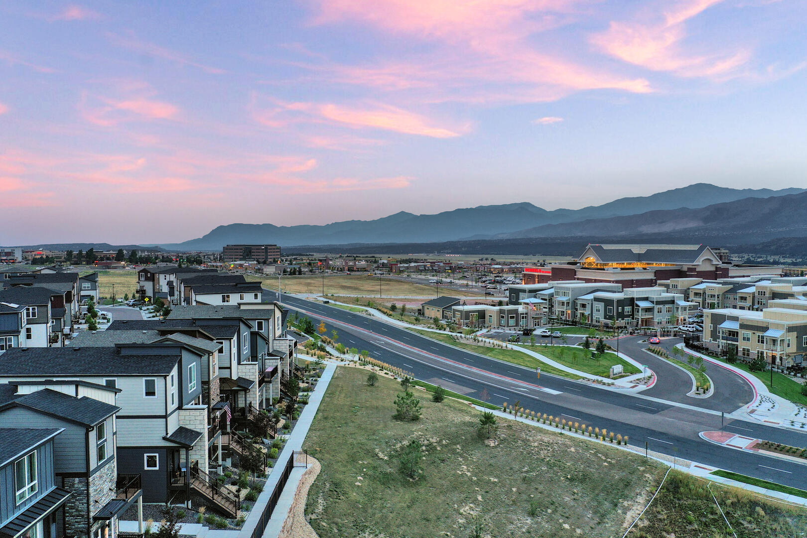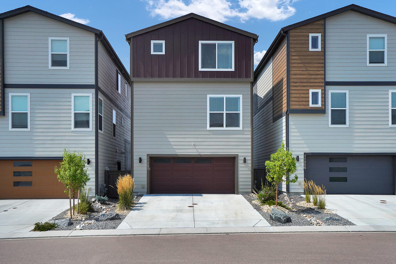 Inside: The fun factor begins with the modern, open design. The 3-Level home has luxurious LVP flooring, upgraded bathrooms, quartz countertops, a gourmet kitchen w/ island, custom light fixtures, plus an Alexa smart home system that controls the radio, lights, and garage door - all activated by your phone, plus there is an Echo system for the upstairs area. The base level of the home features a 2-car garage and a bedroom that doubles as a highly functional office w/ views. The next level of the home features an open great room design w/ the upgraded LVP flooring and a walkout to the private composite deck that showcases those breathtaking views. Back inside. the kitchen has upgraded cabinets, a separate island, a gas range, and a large eat-in dining space. The upper level of the home has two bedrooms. The Owner's Suite is complete with an electric fireplace and a private bathroom & THOSE VIEWS are out of the Owner's bedroom window. The secondary bedroom has access to a separate full bathroom. If you are looking for a home with just the right amount of useful square footage with a modern design that will ignite your senses, you have found it here! You will love the access to the green space and picnic area across the street from the property. This is an amazing new way to live in Colorado Springs! You don't have to maintain a yard. Close access to 1-25 and commutable to both Colorado Springs and Denver.